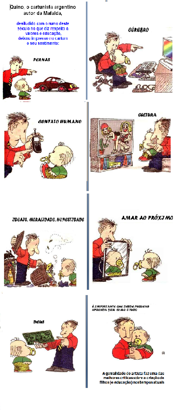 Hoje a educação esta deixando muito a desejar, os pais se esqueceram de qual é seu papel, e pensam que quem deve educar é a escola, que o papel deles, os pais, é apenas colocar comida na mesa, vestir e dar dinheiro para ir à balada.